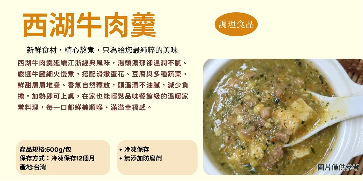 西湖牛肉羹延續江浙經典風味,湯頭濃郁卻溫潤不膩。嚴選牛腱細火慢煮,搭配滑嫩蛋花、豆腐與多種蔬菜,鮮甜層層堆疊、香氣自然釋放,頭溫潤不油膩,減少負擔。加熱即可上桌,在家也能輕鬆品味餐館級的溫暖家常料理,每一口都鮮美順喉、滿溢幸福感。